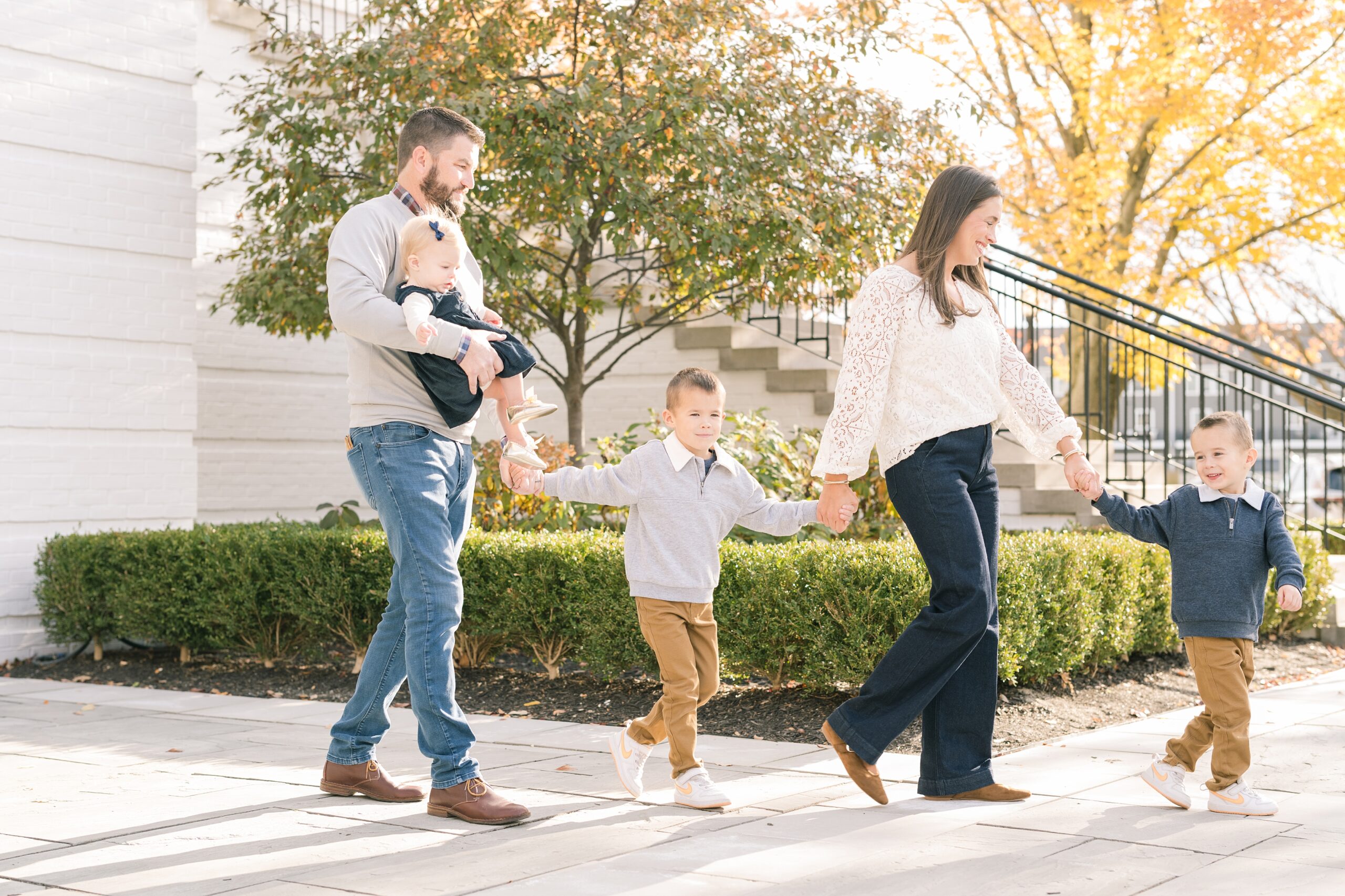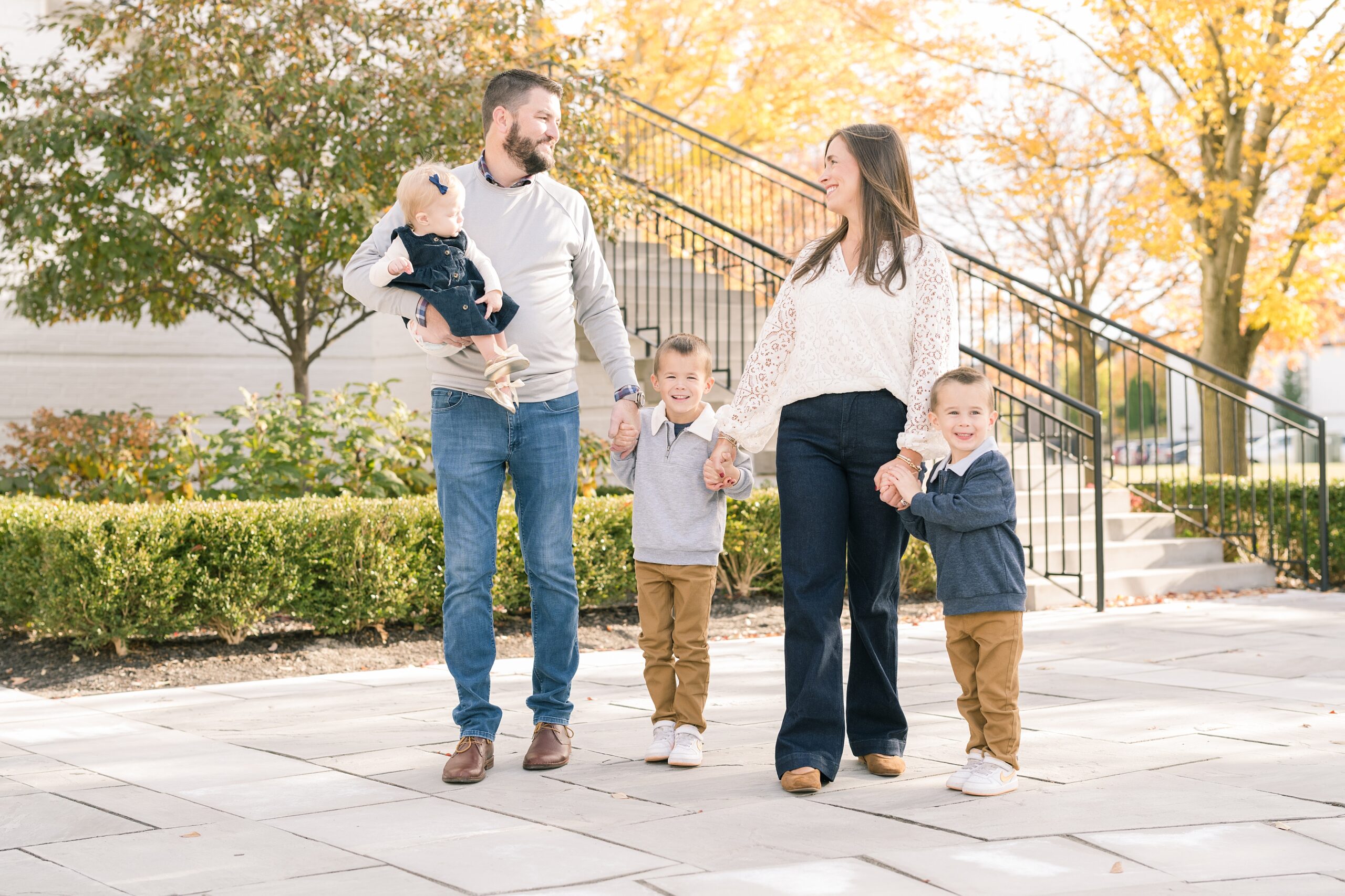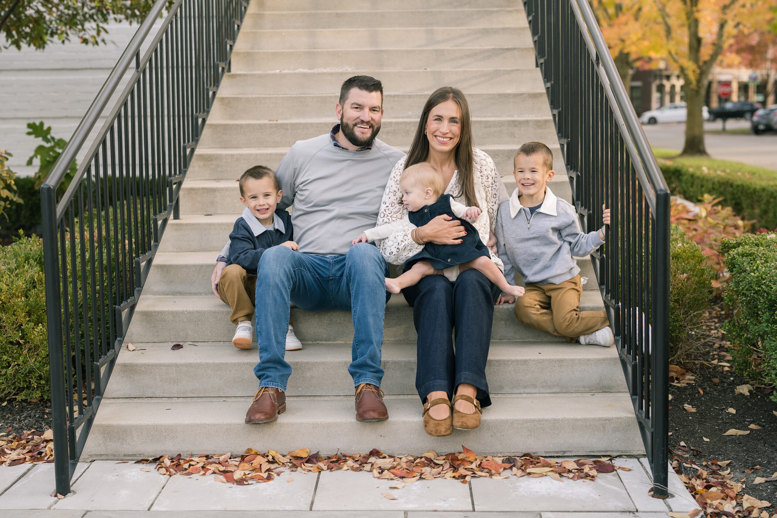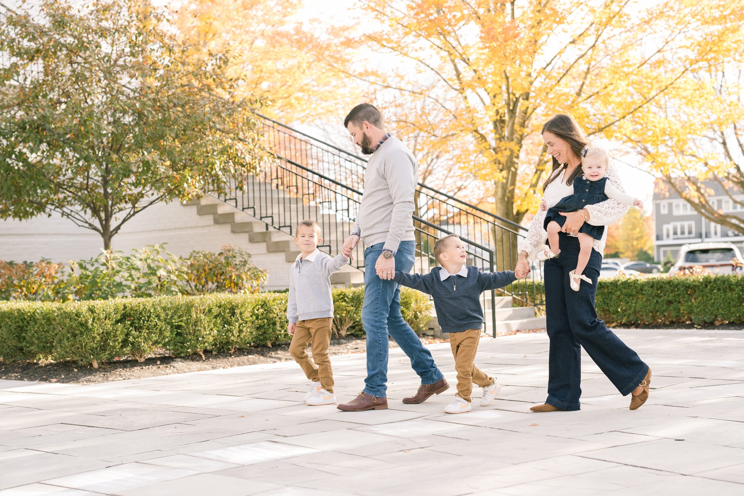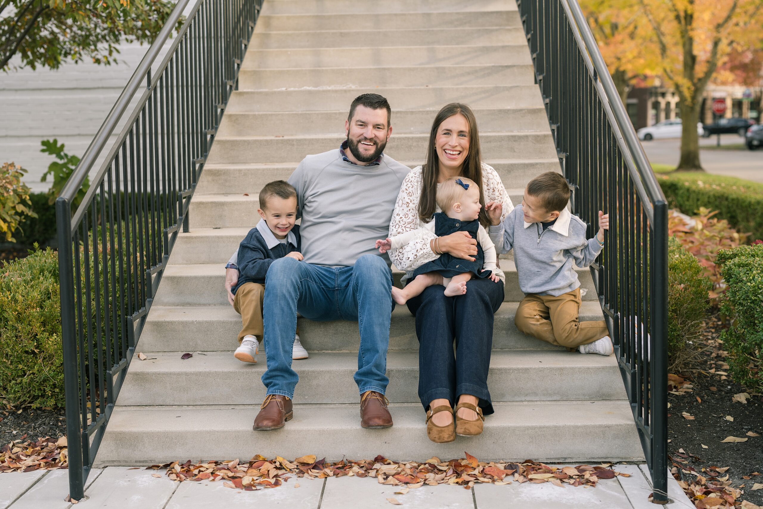 I am so excited to share some favorites from this charming fall portrait session! First, let me say how much of an honor it is when my clients refer me to their friends and family! I am beyond lucky to meet and to work with such fun and down to earth people, it is the best! Second, we had great weather for their fall session! We had scheduled their session for a few days later, however, the forecast called for less than ideal conditions, and, fortunately, Katie and her family were available. And I’m so grateful because it could not have been better! We had fall color, we had sunshine, and we had the kind of temperature where you could be comfortable in light layers or a sweater, which is so great for little ones! Enough about the weather, let’s get to the good stuff! Meet Katie and Kevin and their adorable kiddos, Owen (6), Emmett (4), and Ceci (11 months)! As the late afternoon sun illuminated our time, I simply enjoyed their sweet interactions as a family of 5. Ceci is blessed with two handsome big brothers who are completely smitten with her! And just wait until you see her tiny little golden slippers! She is so expressive, and I couldn’t adore her or her whole family more! It was so refreshing to see their sweet sibling dynamic, and they know how to make her laugh and smile! This dream session had the perfect balance—sweet and silly, calm and spirit. With their vivacious personalities and tender moments, we captured so much in such a short time, and I’m excited to share a little peek into that evening with you!