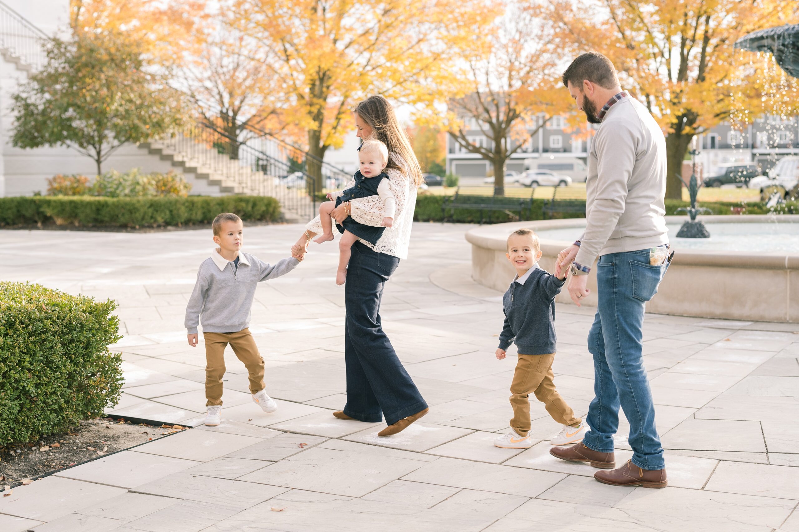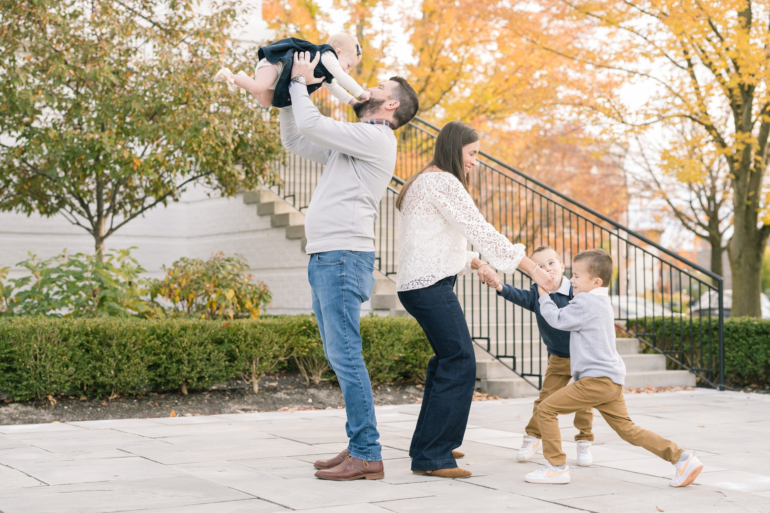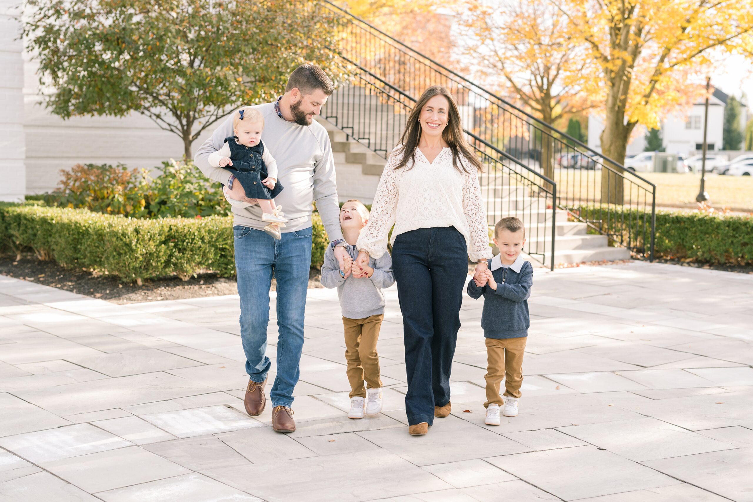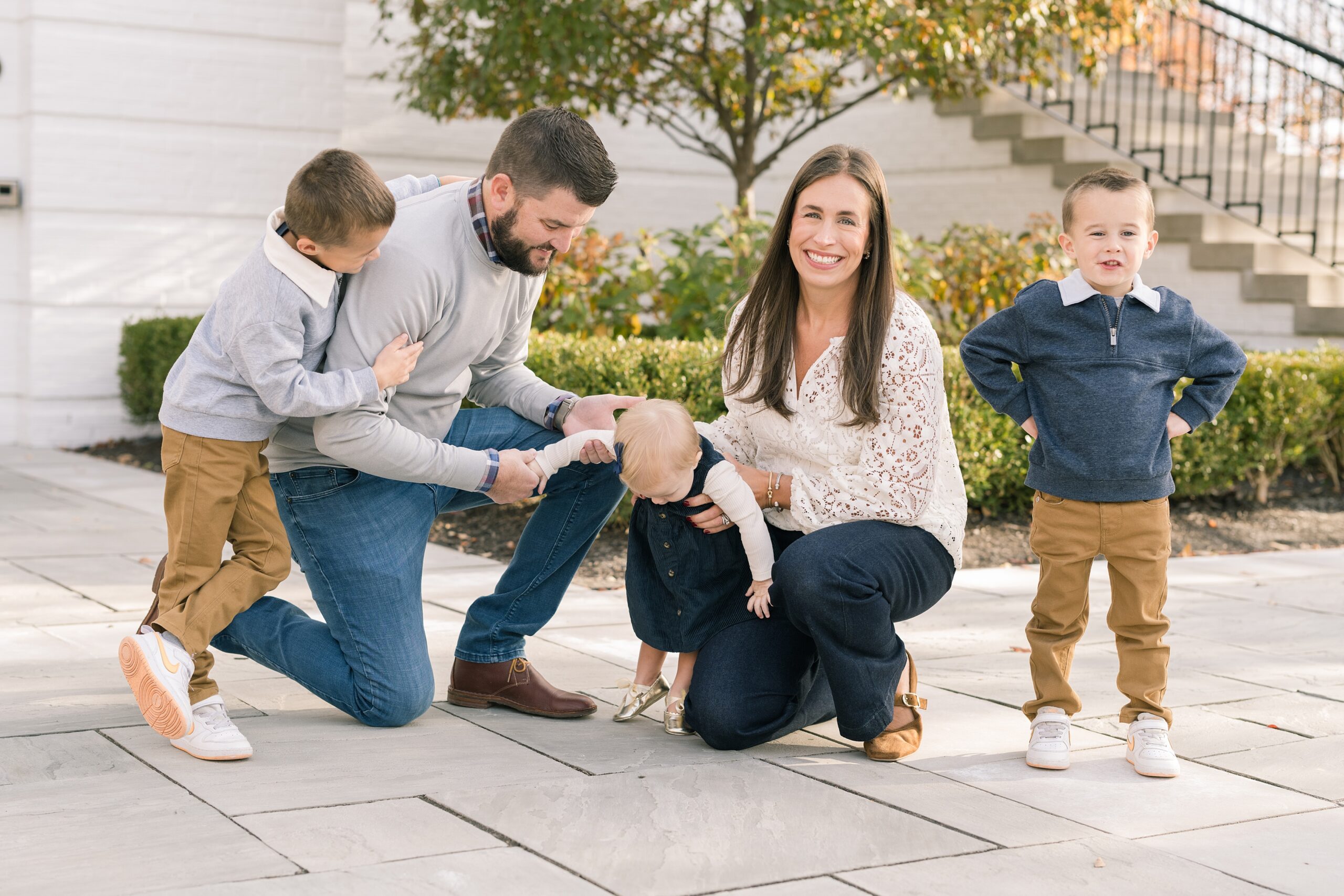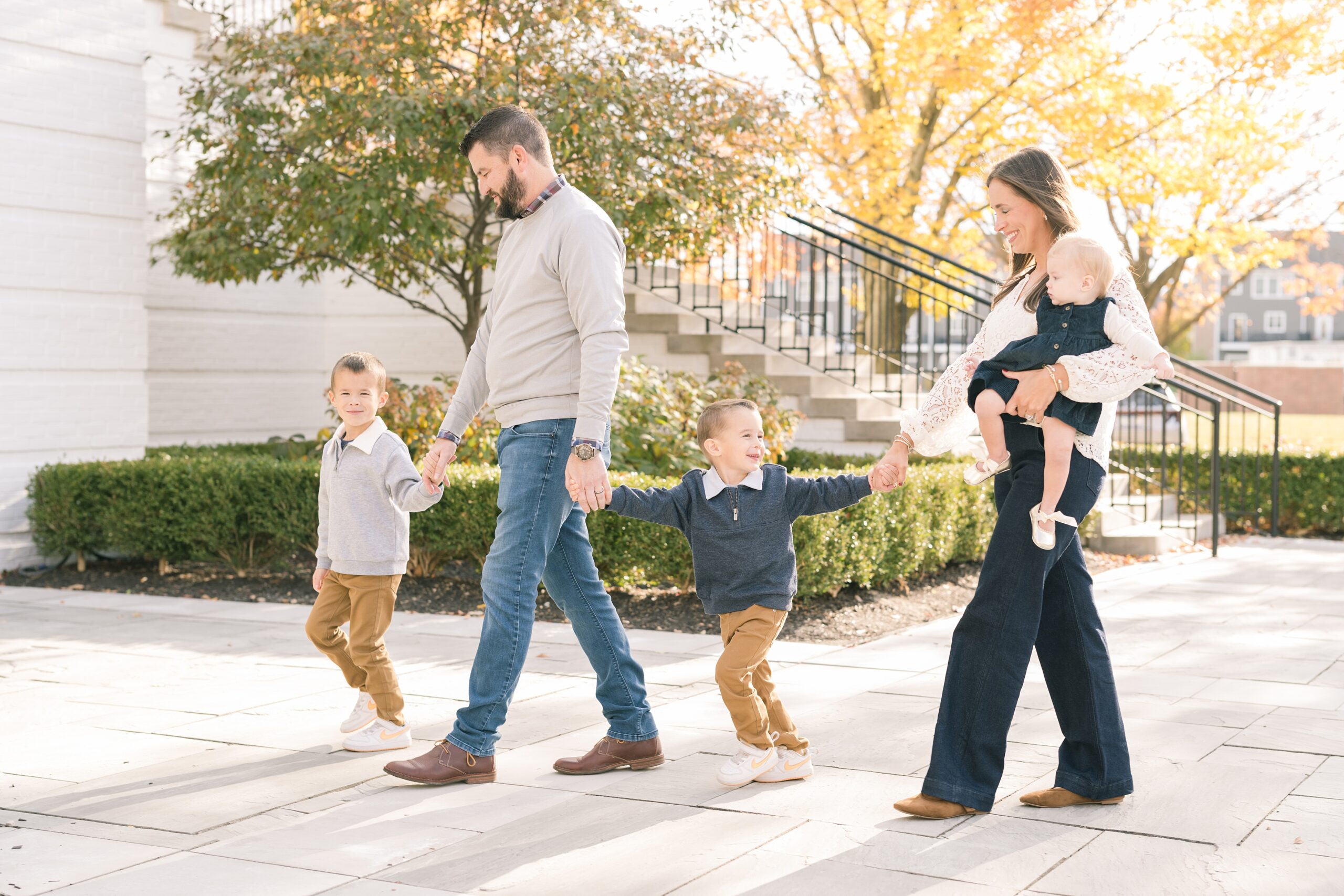 I am so excited to share some favorites from this charming fall portrait session! First, let me say how much of an honor it is when my clients refer me to their friends and family! I am beyond lucky to meet and to work with such fun and down to earth people, it is the best! Second, we had great weather for their fall session! We had scheduled their session for a few days later, however, the forecast called for less than ideal conditions, and, fortunately, Katie and her family were available. And I’m so grateful because it could not have been better! We had fall color, we had sunshine, and we had the kind of temperature where you could be comfortable in light layers or a sweater, which is so great for little ones! Enough about the weather, let’s get to the good stuff! Meet Katie and Kevin and their adorable kiddos, Owen (6), Emmett (4), and Ceci (11 months)! As the late afternoon sun illuminated our time, I simply enjoyed their sweet interactions as a family of 5. Ceci is blessed with two handsome big brothers who are completely smitten with her! And just wait until you see her tiny little golden slippers! She is so expressive, and I couldn’t adore her or her whole family more! It was so refreshing to see their sweet sibling dynamic, and they know how to make her laugh and smile! This dream session had the perfect balance—sweet and silly, calm and spirit. With their vivacious personalities and tender moments, we captured so much in such a short time, and I’m excited to share a little peek into that evening with you!
