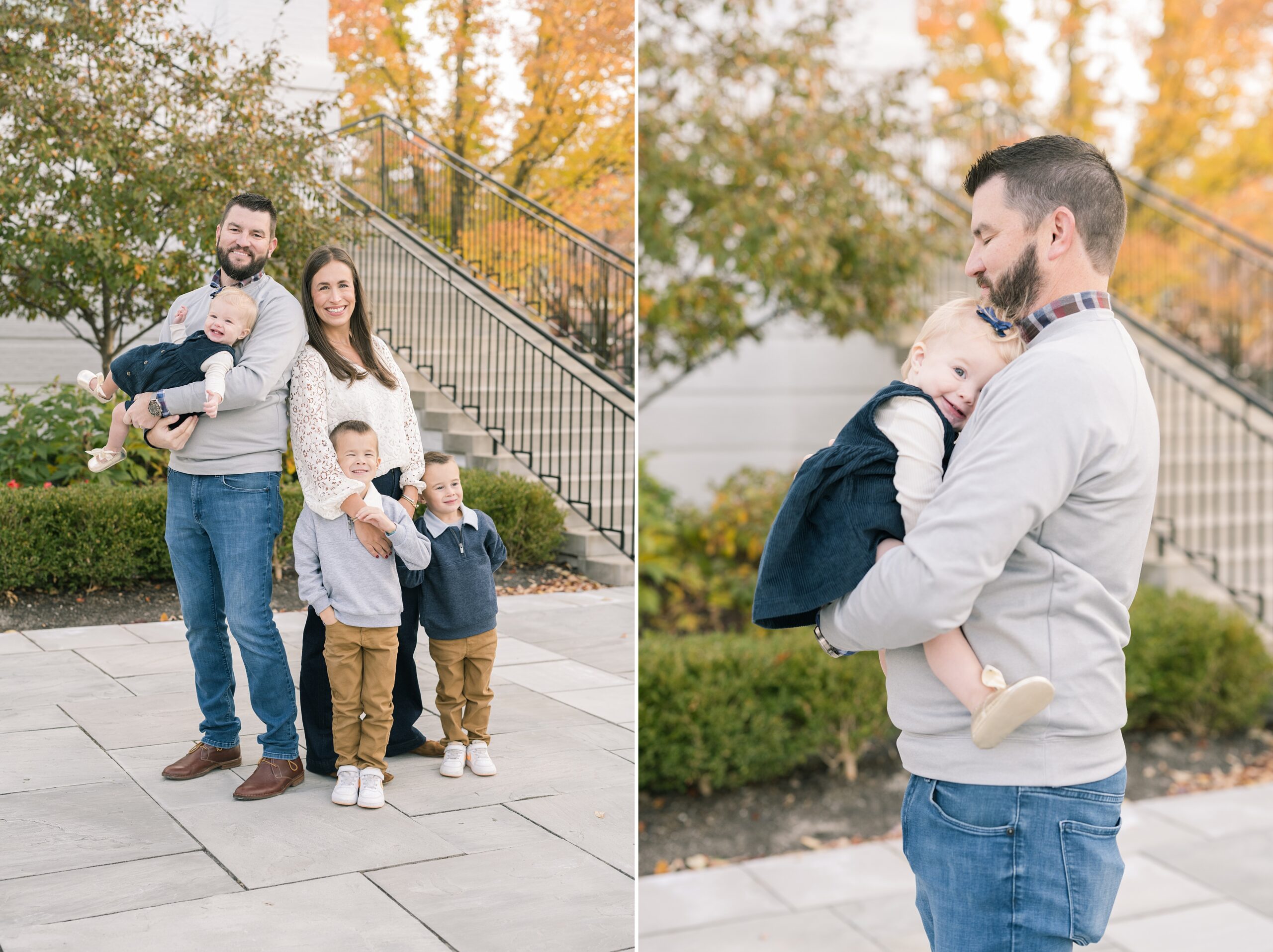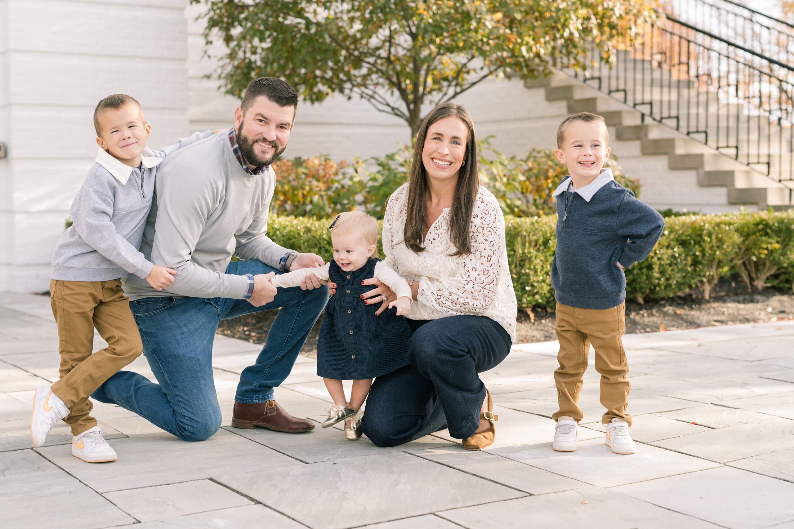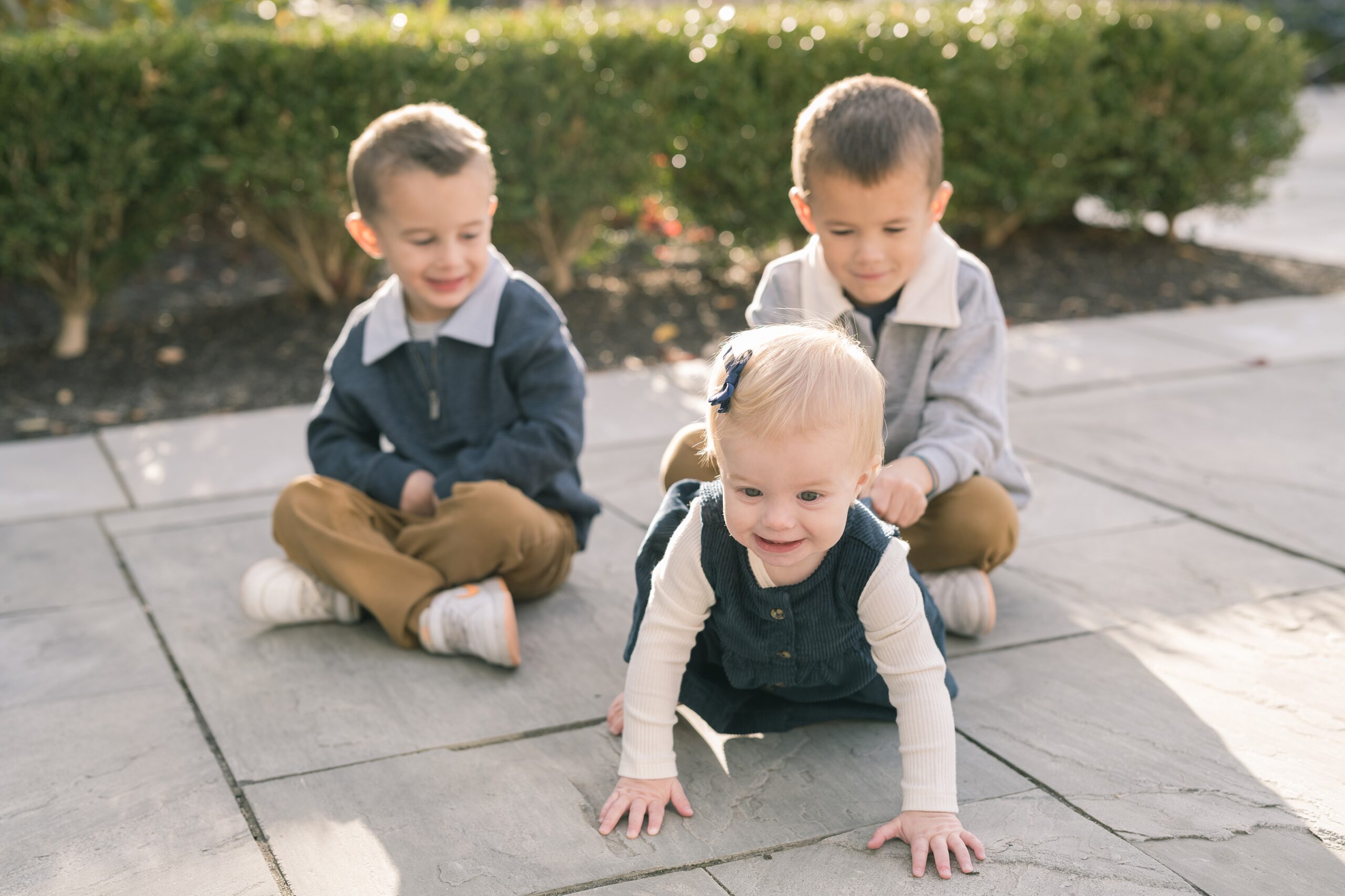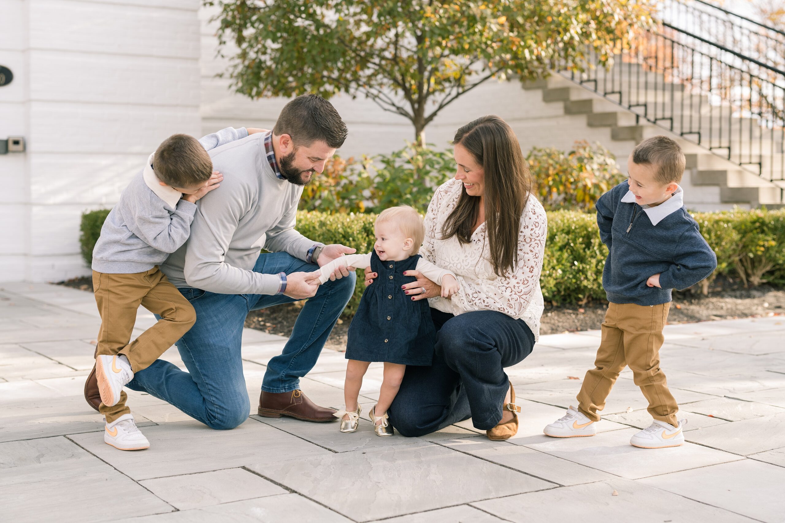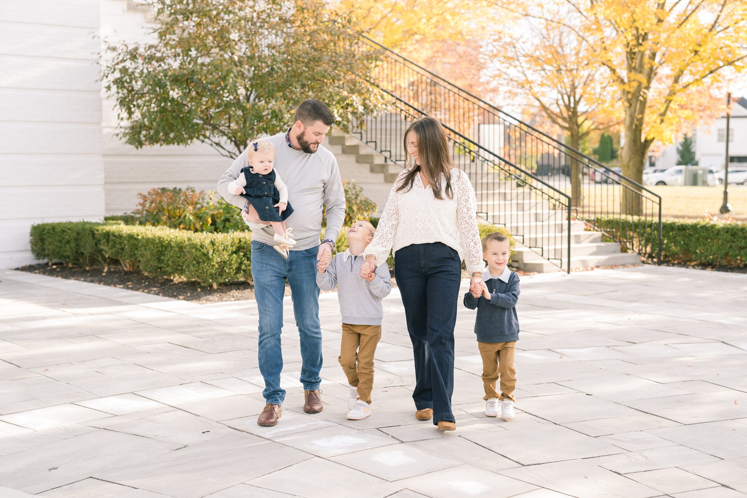 I am so excited to share some favorites from this charming fall portrait session! First, let me say how much of an honor it is when my clients refer me to their friends and family! I am beyond lucky to meet and to work with such fun and down to earth people, it is the best! Second, we had great weather for their fall session! We had scheduled their session for a few days later, however, the forecast called for less than ideal conditions, and, fortunately, Katie and her family were available. And I’m so grateful because it could not have been better! We had fall color, we had sunshine, and we had the kind of temperature where you could be comfortable in light layers or a sweater, which is so great for little ones! Enough about the weather, let’s get to the good stuff! Meet Katie and Kevin and their adorable kiddos, Owen (6), Emmett (4), and Ceci (11 months)! As the late afternoon sun illuminated our time, I simply enjoyed their sweet interactions as a family of 5. Ceci is blessed with two handsome big brothers who are completely smitten with her! And just wait until you see her tiny little golden slippers! She is so expressive, and I couldn’t adore her or her whole family more! It was so refreshing to see their sweet sibling dynamic, and they know how to make her laugh and smile! This dream session had the perfect balance—sweet and silly, calm and spirit. With their vivacious personalities and tender moments, we captured so much in such a short time, and I’m excited to share a little peek into that evening with you!
