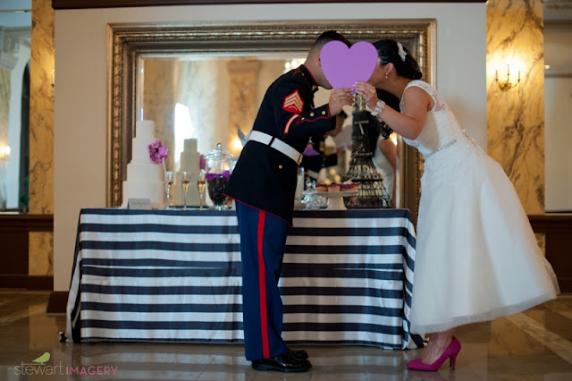 Upon returning home from Europe, the pair planned their wedding day and knew that it must include elements from their time spent together in Paris. Decor and styling details were chosen based on favorite places they visited together, such as cafes where they shared dessert and streets where they strolled hand in hand. Even their beloved pup joined them after the ceremony for photos! And the palette was chosen to remind them of the vivid and sweet orchid hues of the trees and flowers in bloom all around the city where their love story unfolded.