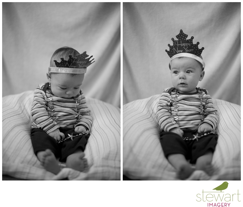 Yes, we’re almost half way through January, and I’m writing a post entitled Happy New Year… Better late than never, right?! While editing, I found some photos I took of my little guy who was sweet enough to indulge me for a few quick shots with a party hat (which is really a tiara, ooops!) and beads. Remington was 16 weeks in these images – he turns 4 months tomorrow! Whoa!!! Time has flown by these past few months! After getting caught up from being on maternity leave, I’ve finally found some time here and there to work on images that I’ve taken of Remington. He keeps me on my toes for sure! I’ll start with these for now with some newborn images to come soon!